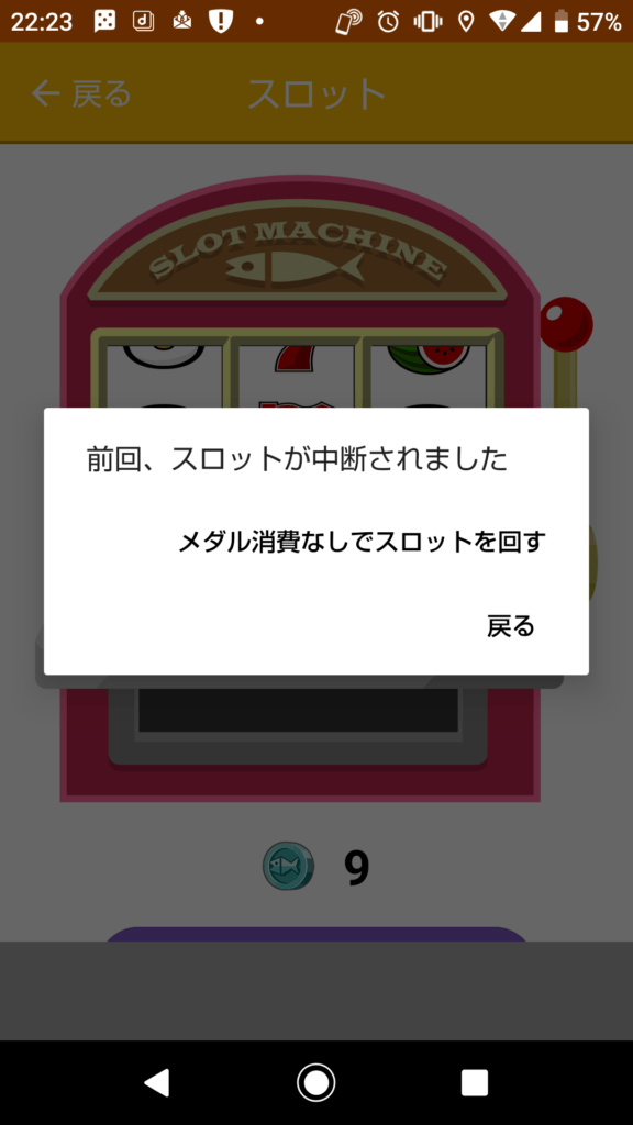- メッセージの「メダル消費なしでスロットを回す」をクリック。